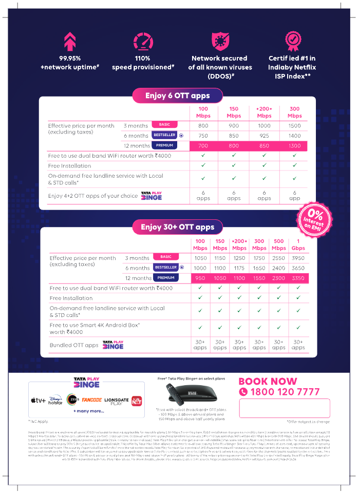 300 Mbps & above speed plans are available in select cities & areas and is subject to technical feasibility. Please call contact center to know availability in your area.